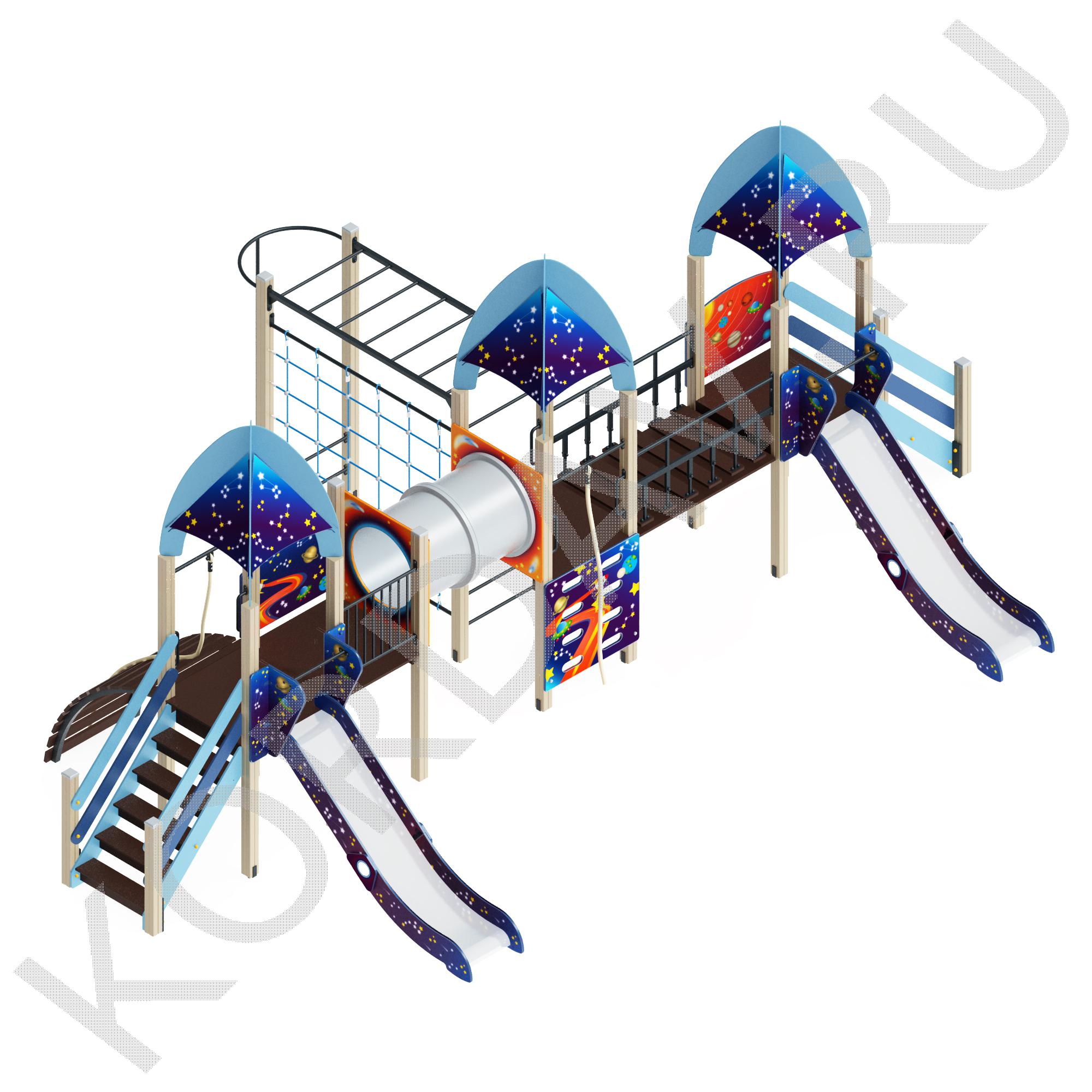 - Конструкция: Две башни из четырёх клеёных брусьев (100х100 мм, высота 2500 мм). Пол — ламинированная фанера с антискользящим покрытием (18 мм, 1000х1000 мм). Одна башня из четырёх клеёных брусьев (100х100 мм, высота 2500 мм), соединённых с брусьями (100х100 мм, высота 2300 мм). Пол — ламинированная фанера с антискользящим покрытием (18 мм, 1900х1000 мм).
