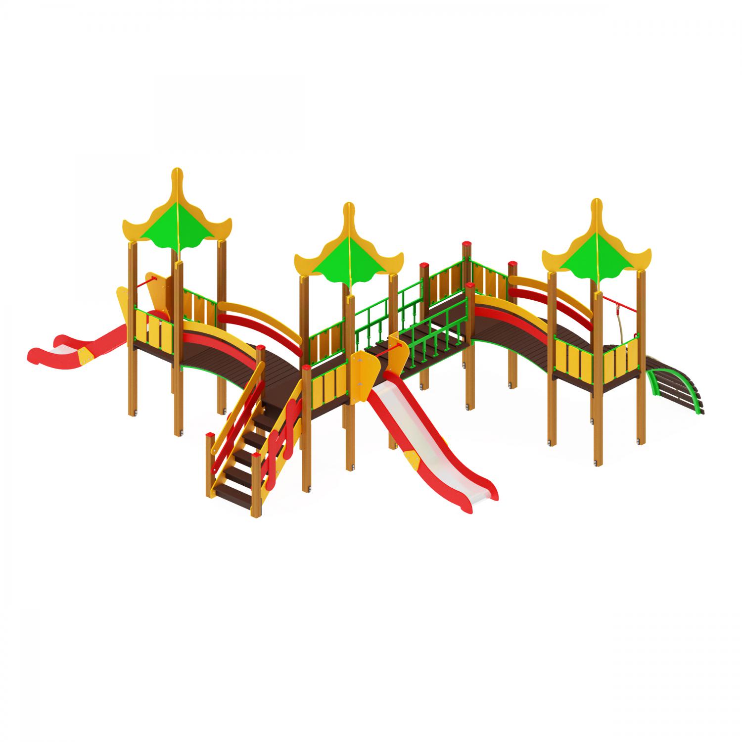 Башни: Изготовлены из четырёх склеенных между собой брусьев сечением 100×100 мм и высотой 2800 мм. Пол башен сделан из ламинированной фанеры с антискользящим слоем, размером 1000×1000 мм и толщиной 18 мм, установленный на высоте 1200 мм от уровня площадки. Над каждой из трёх башен располагается четырёхскатная крыша, собранная из фанеры и укреплённая на декоративные арки толщиной 18 мм. Четвёртая башня немного ниже – её высота 2000 мм, и она также оснащена полом из ламинированной фанеры с антискользящим покрытием и без крыши. Всего башен предоставляется четыре штуки.