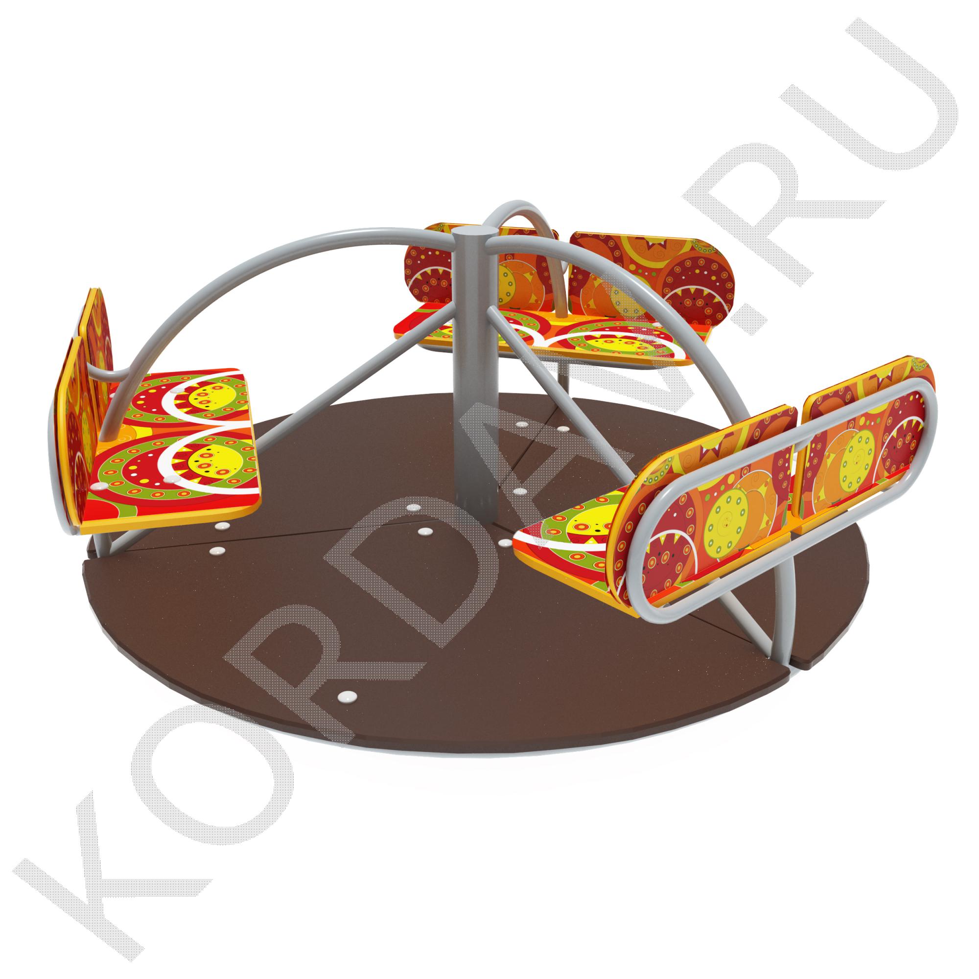 Карусель имеет шесть мест со спинками. В ее основании лежит круглая платформа, которая приводится в движение с помощью рук. Цветовая гамма изделия – это сочетания синего и желтого. Весит такая карусель 96 кг. Отлично подойдет для детей старшего дошкольного возраста. Такую карусель можно установить на любой площадке для детей, используя бетонный фундамент. Она проста в установке и эксплуатации. Отлично развивает физические навыки ребенка, а именно его вестибулярный аппарат, ловкости, мышцы рук и ног.