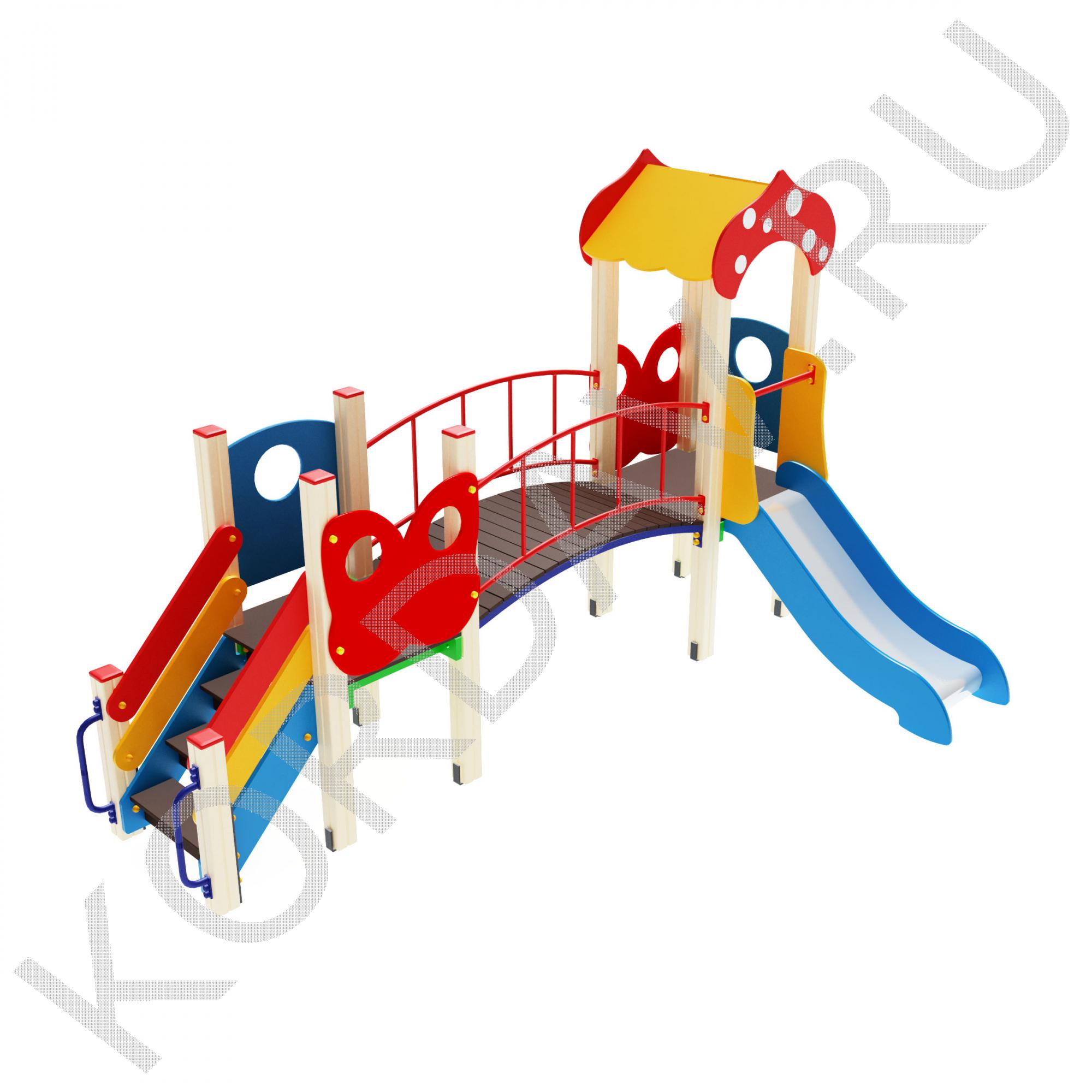 Комплекс ПДИ 1.17 для игр детей 3-7 лет состоит из: двух башен, маленькой лестницы, горки, четыре ограждения для башен, дугообразный мост и ограждение для моста. Металлические элементы имеют закругленную форму, все швы тщательно обработаны. Все стальные детали окрашены порошковой краской, стойкой к коррозии и атмосферным осадкам, а закладные части покрыты двумя слоями краски. Деревянные части ПДИ 1.17, подверженные воздействию осадков покрыты полиуретановой краской, на остальные изделия из фанеры нанесена акриловая водно-дисперсная краска. Большая башня высотой 2,5 м имеет двухскатную крышу и ограждения из влагостойкой фанеры. Для декора использованы стилизованные арки. Малая башня, как и большая состоит из 4-х оснований из клеёных брусьев 100*100 мм. Полы в башнях устланы ламинированной древесной плиты, с нанесенным антискользащим покрытием. Мини лестница изготовлена из фанеры толщиной 18 мм с ламинированным покрытием, а бортики из влагостойкой 27 мм. Для скат-горки использована нержавеющего листа сталь толщиной 1,5 мм шириной 540 мм. Для безопасности по краям есть 30 мм бортики, для опорного каркаса горки взят профиль 40*25 и трубы 32 диаметром. Дугообразный каркас моста состоит из сварной стальной трубы диаметром 32 и полосы 40*4 мм. Дуга с плавным радиусом окрашена в синий цвет. Протяженность моста 1,5 м, а его ширина 0,8 м. Ограждение является парной сварной конструкцией с плавным радиусом, окрашенной в красный цвет.