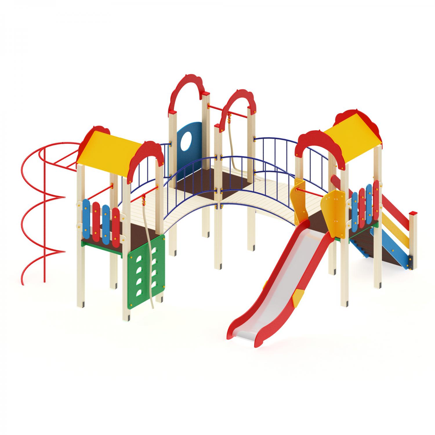 В игровой комплекс входит:Башня 3шт, Горка, Скалолаз, Дугообразный мост 2шт, Канат 2шт, Вертикальный шест со спиралью, Лаз.