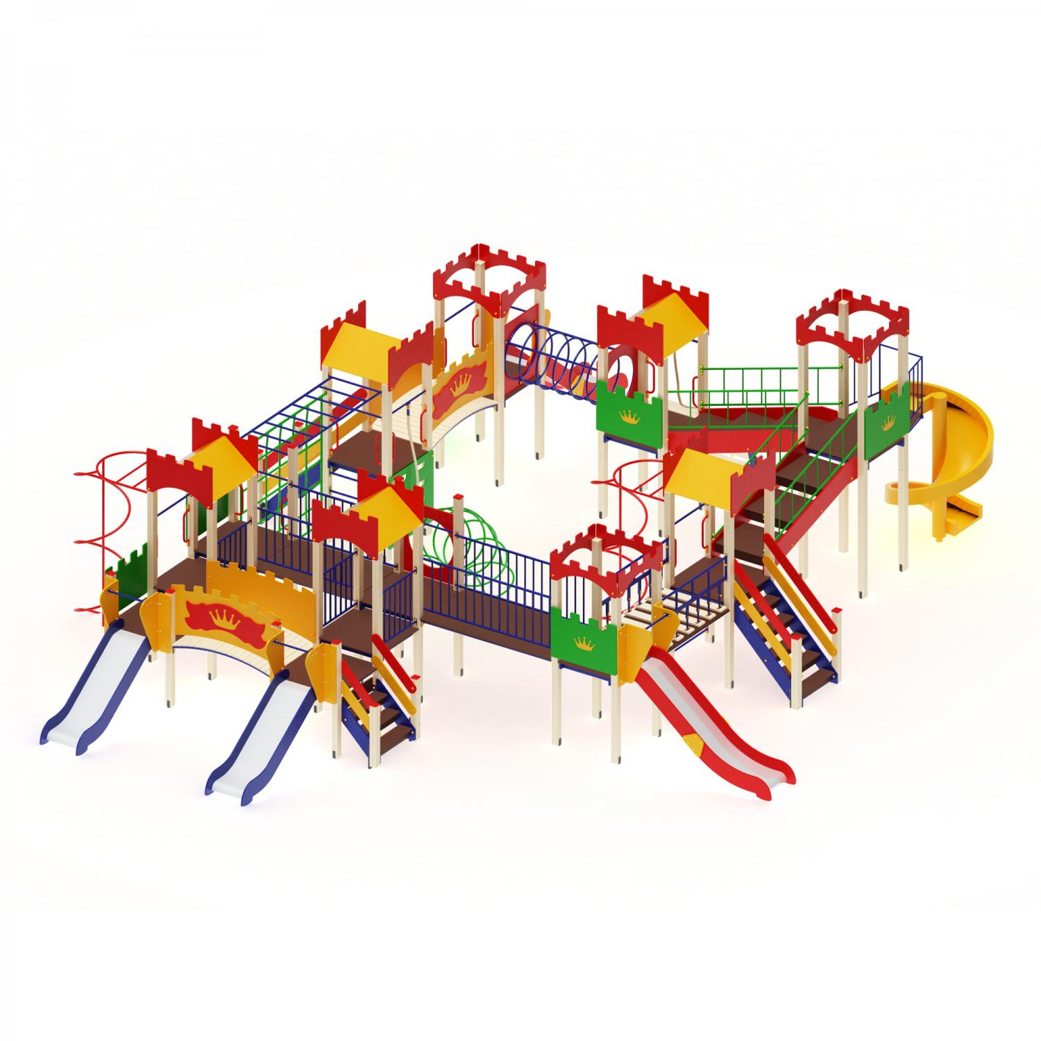 Большой комплекс для детских игр включает в себя: 8 башен; 2 моста ровных, лаз из стальных труб, 3 скат-горки, 2 вертикальных спирали с шестом, лаз из колец, рукоход, подвесной мост, 2 моста наклонных со ступенями, горизонтальный лаз из колец, бум с канатом, 2 скалолаза, 3 лестницы с поручнями, винтовая скат-горка из пластика, дугообразный мост, шведские мини-стенки. Для безопасности детей на площадках башен и рядом с игровыми элементами установлены борта из фанеры и металлические ограждения. Для изготовления комплекса используют: листы нержавеющей стали; брусья клееные 100х100 мм; стальные полосы 40 х 4 мм; фанера ламинированная с нескользким слоем 24 мм; фанера влагостойкая 9, 18, 24 и 32 мм; трубы с круглым сечением 27 и 32 мм; канаты 28 мм; крепежные элементы и заглушки. Вся конструкция покрыта износостойкими красками: фанерные и деревянные детали окрашены полиуретановой краской, а на стальные нанесено 2 слоя порошковой краской.
